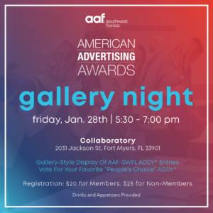 AAF-SWFL is proud to showcase the best in local advertising creative. The 2020 American Advertising Awards Gala is your night to shine as we award the industry’s most coveted award, the ADDY. Along with the the Silver and Gold ADDY awards, the People’s Choice, Myra Janco Daniels Best of Show Award, and the AAF Silver Medal Award will be handed out that night.